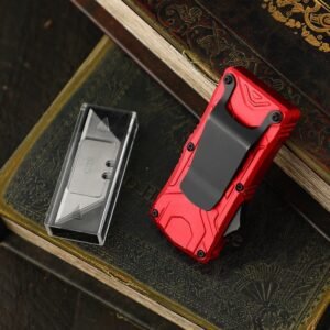 Description: This small Out The Front utility knife fits in a pocket, removes the replacement blade, and comes in a beautiful gift box. It has an excellent safety device to keep the blade from dropping in any situation, and the handle is made of carbon fiber material, making it smoother in the hand.