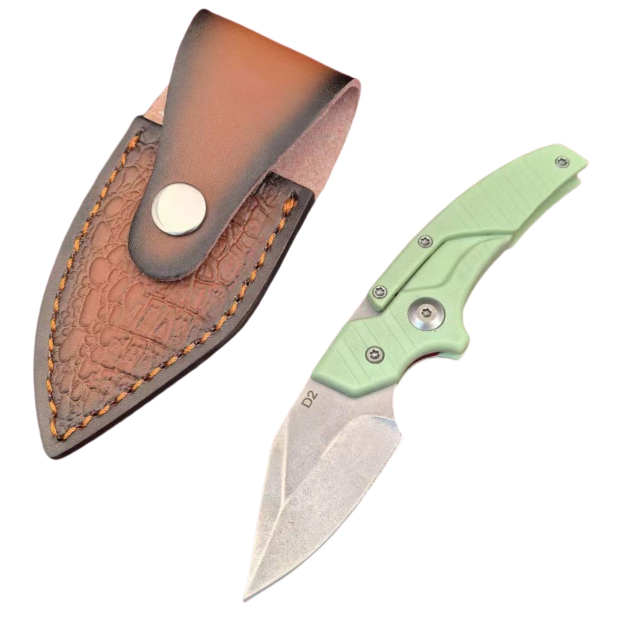 Small D2 Blade -  Push Knife DaggerTotal length: 108mm Blade length: 50mm Handle length: 58mm Blade material: D2 Hardness: 60HRC Surface treatment: sanding Blade thickness: 8.2mm Net weight: about 210 grams Handle material: imported G10 Scabbard: leather sheath CNC water grinding and manual grinding, a small tool that can be hidden in the belt or hung around the neck.